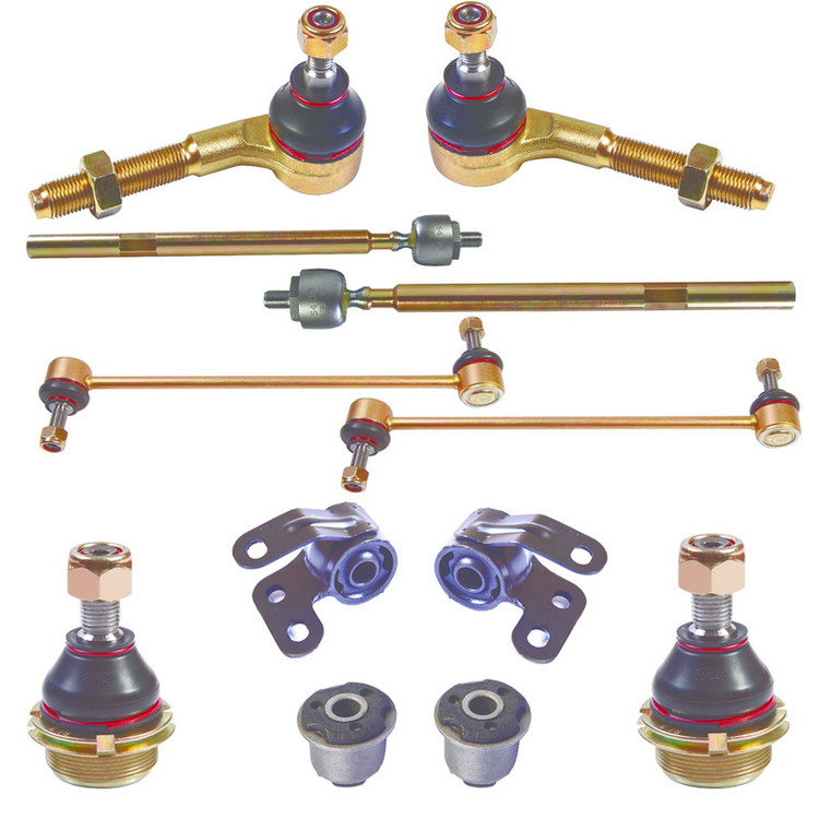 دوعدد سیبک زیر اکسل،دو عدد سیبک فرمان،دو عدد سیبک مفصل فرمان، دوعدد بوش طبق لبه دار،دو عدد بوش طبق جناقی،دو عدد سیبک تعادل
